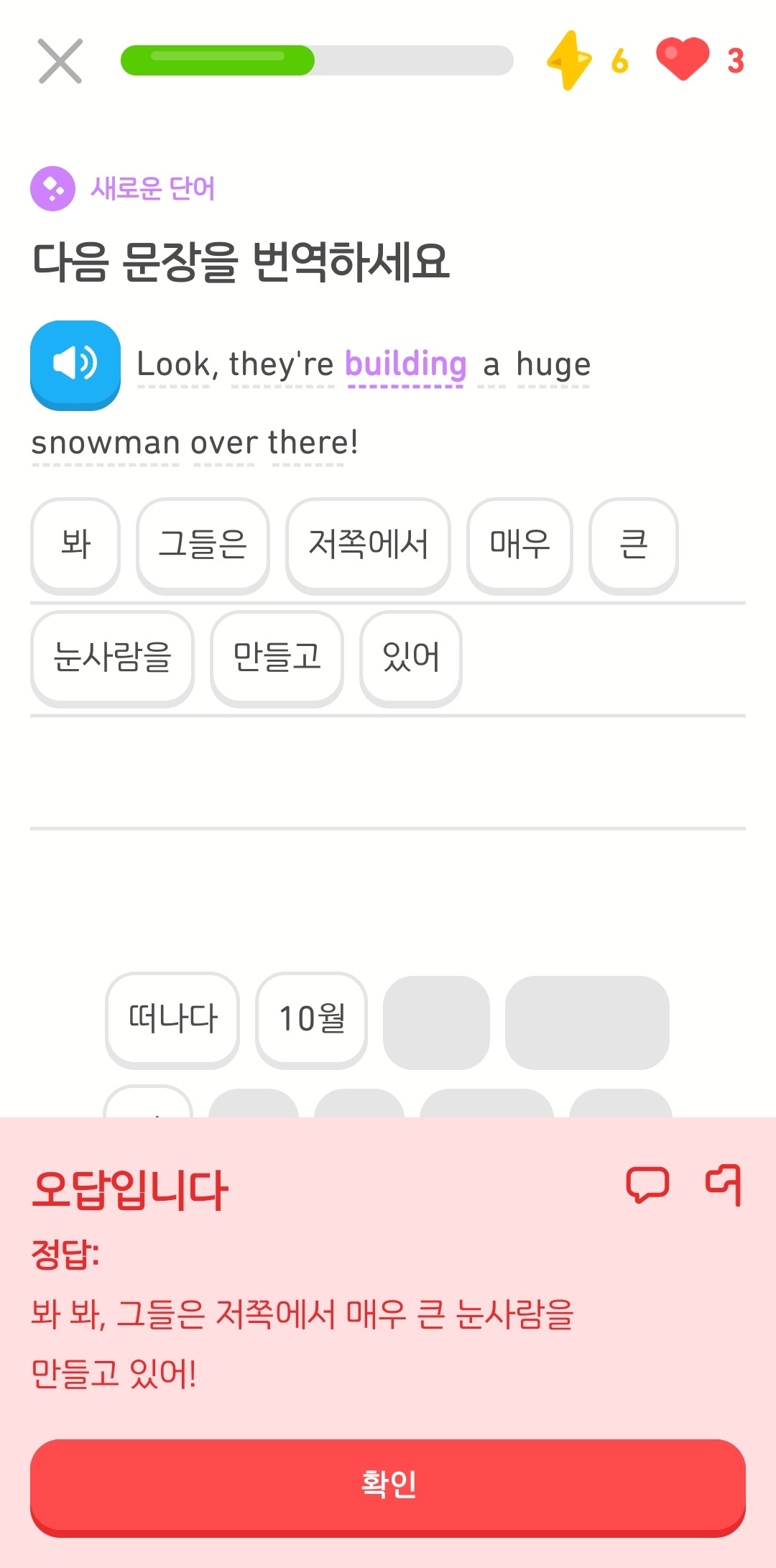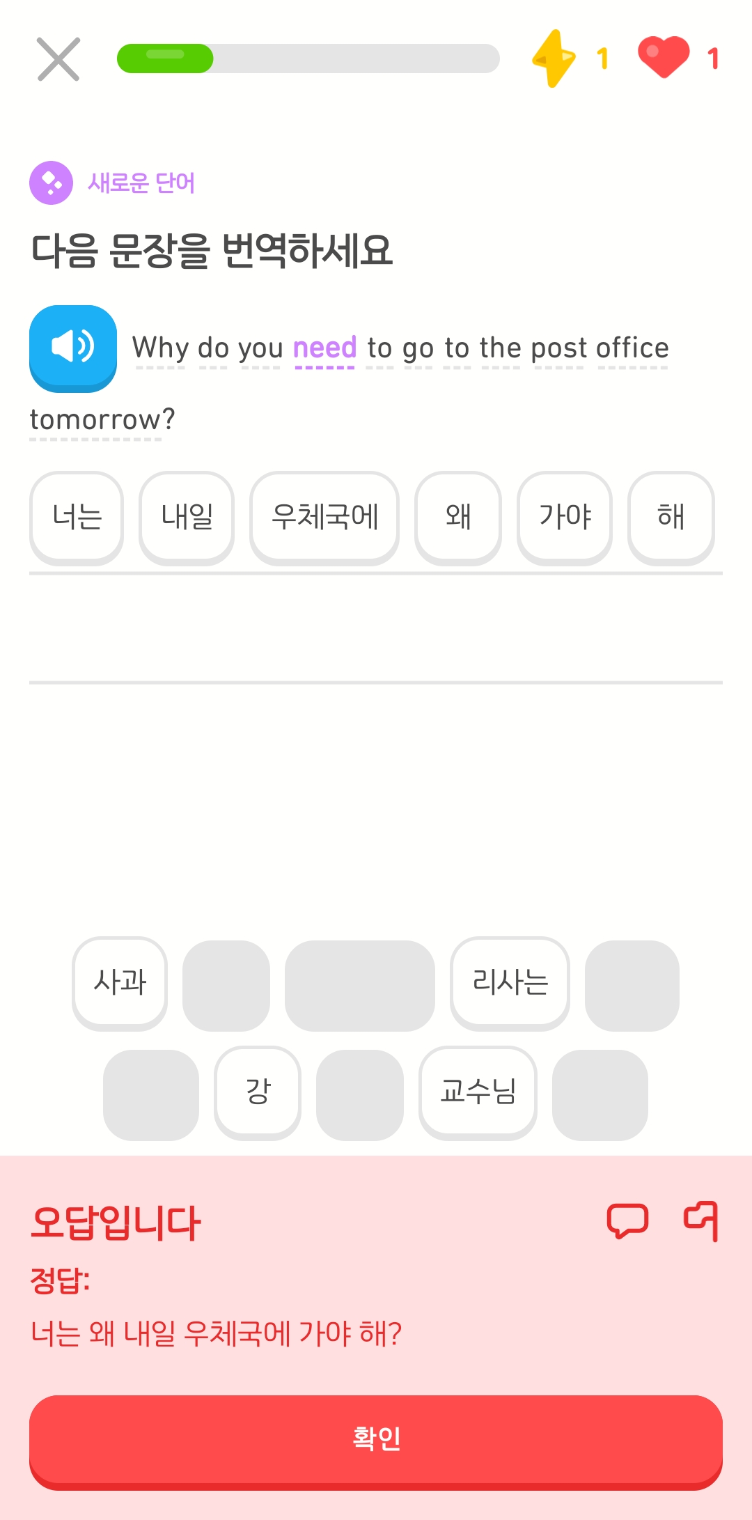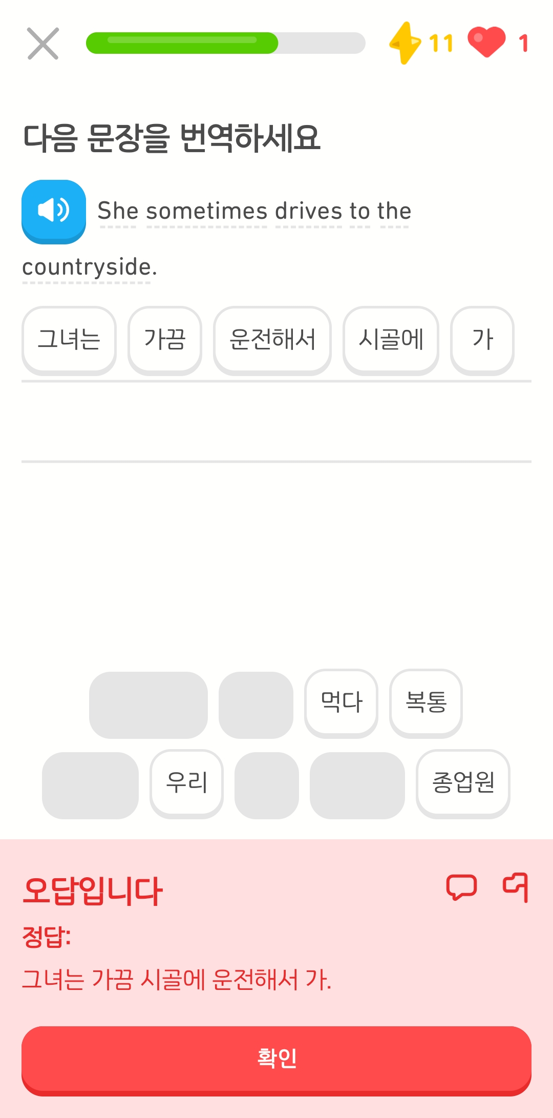 듀오링고 이 자식이 자꾸 틀렸다고 하는 것이다.